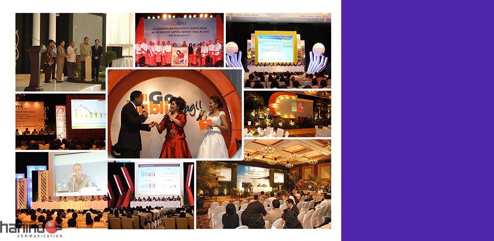 Our excellence in event Organizing business is reflected in the number of national private corporations and State-owned companies that have trusted us to manage their events such as Public Expose, Shareholders General Meeting, Corporate Social Responsibility, Internal Meeting, Seminar or Outing.
